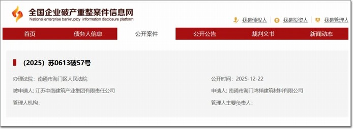 本院于2025年12月22日裁定受理申请人南通市海门鸿祥建筑材料有限公司对被申请人江苏中南建筑产业集团有限责任公司破产重整一案,并于2025年12月23日指定江苏中南建筑产业集团有限责任公司清算组担任江苏中南建筑产业集团有限责任公司管理人。