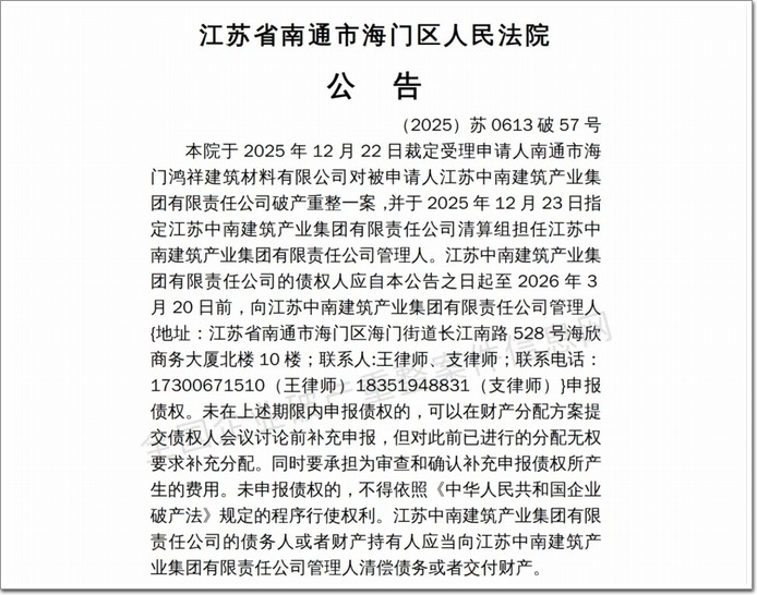 江苏中南建筑产业集团有限责任公司的债权人应自本公告之日起至2026年3月20日前,向江苏中南建筑产业集团有限责任公司管理人申报债权。