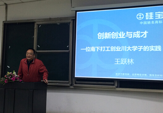 2015年12月29日,成都硅宝科技股份有限公司董事长王跃林博士在四川大学高分子科学与工程学院,满怀激情地做了《创新·创业·成才》的专题演讲,和同学们分享了他本人作为一位南下打工创业的川大学子的成长实践经历,为在场的莘莘学子带来创业宝典。四川大学高分子科学与工程学院院长傅强等领导亲临会场聆听讲座。