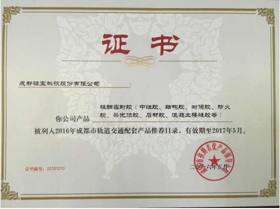 会议同期发布了《2016年成都市轨道交通配套产品推荐目录》。凭借强大的品牌影响力、过硬的产品质量、优质的售后服务体系,硅宝中性胶、结构胶、耐候胶、防火胶、采光顶胶、石材胶、混凝土接缝胶等系列硅酮密封胶产品,成功入选《2016年成都市轨道交通配套产品推荐目录》。此次入围配套产品推荐目录的产品,均为硅宝的明星产品,均有专利和科技成果支撑;硅宝产品成功入围该目录,为硅宝科技提升企业知名度和美誉度,扩大市场占有率提供了有力保障,奠定了坚实的基础。