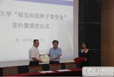 2014年4月18日,重庆大学 “硅宝科技种子奖学金”签约暨颁奖仪式在重庆大学举行。硅宝科技总经理王有治,重庆大学校长助理、教育发展基金会副理事长赵骅、教育基金会秘书长张军、学工部副部长罗涤等出席了仪式。仪式由重庆大学教育发展基金会副秘书长何荣山主持。