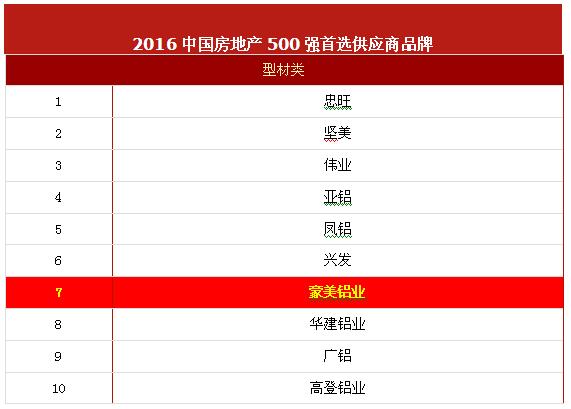 2016年3月22日,“2016年中国房地产500强测评成果”在北京盛大发布。此测评成果发布会一直被誉为房地产行业百家企业“奥斯卡”盛典,豪美铝业首次上榜,荣获2016中国房地产500强开发商首选品牌?型材类榜单!