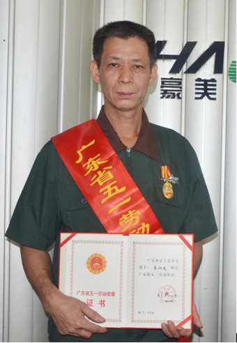 “广东省五一劳动奖章”,是经全省各级工会组织自下而上的逐级推荐评选和全国总工会、省总工会而审定,是劳动者的至高荣誉,是劳动者典范和楷模的美称。豪美铝业熔铸车间员工李六友,自1991年1月入职我司,23年来,脚踏实地、兢兢业业,不仅在岗位上做好本职工作,还积极发扬创新精神,凭借累积多年的丰富现场生产经验,对熔铸设备做了很多改进,为公司发展做出贡献。