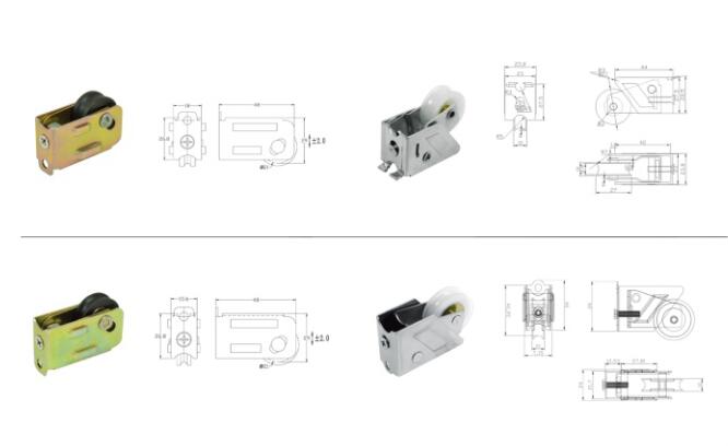 滑轮 JG/T 129-2007 定义:由可绕中心轴转动有沟槽的圆盘和跨过圆盘的部件所组成的可以绕着中心轴转动的简单机械叫做滑轮。 性能指标:一套滑轮按实际承载质量做反复启闭实验,门用滑轮达到100000次,窗用滑轮达到25000次后,轮体能正常滚动,达到实验次数后,在承受1.5倍的承载质量时,启闭力不应大于100N。 使用范围:推拉窗、推拉门  选用安装说明: 滑轮的选用 1、滑轮的选用需根据门窗扇的重量和铝型材的安装空间及滑轮的承重量确定: 1)门窗扇的重量=(玻璃重量+扇型材重量)x安全系数1.3 2)确定扇下方与下滑的配合空间和下滑轨道形状尺寸,滑轮转动轮子的形状和尺寸需与下轨的形状相吻合。 3)根据分别满足第1、2项门窗扇重和门窗扇下方、下轨配合尺寸要求,选择符合与其相应要求的滑轮。