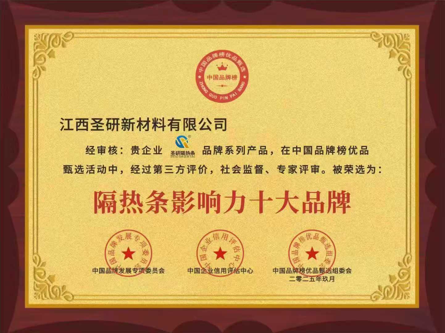证书名称: 隔热条影响力十大品牌
