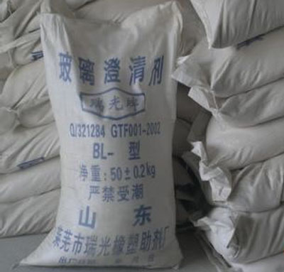 1,白砒 又称亚砷酐,是澄清效果极好的一种常用澄清剂,玻璃行业俗称“澄清王”。但白砒必须与硝酸盐配合使用才能达到良好的澄清效果。白砒微溶于冷水,易溶于热水,剧毒,呈白色结晶粉末或无定形的玻璃状物质,黄金冶炼副产品砷灰常呈灰白,灰色或灰黑色等,作为澄清剂多用晶态白砒。当白砒加热到400度以上时,与硝酸盐在高温时放出的氧气生成五氧化二砷,加热至1300度时,五氧化二砷分解生成三氧化二砷,使玻璃液气泡中气体的分压减少,有利于气泡的长大,加速气泡的排除,从而达到澄清的目的。