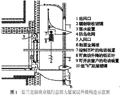 遮阳的综合改进。由于太阳直射对建筑的冷热负荷有直接影响,冬季的阳光进入室内,夏季遮阳都能有效地控制负荷总值。但传统建筑中的百叶或挂于室内,难以高效控制已入室内的热量;或悬于室外,不能形成循环通风道,或多或少地对建筑节能有一定的负面影响。中挂百叶是幕墙改革的一个较好方案,法兰克福商业银行总部大厦[2 ] 是其中一个较好的例子,见图1。这种百叶幕墙解决了适时调节百叶的角度,以最佳状态达到节能的目的。