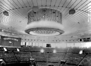 一种处于空间受力状态的结构,多用于大跨度屋盖结构中。按结构形式分为:①圆形单层悬索结构(图1a)。用于圆形平面的屋盖,其索按辐射状布置,整个屋面形成下凹的旋转曲面。各根索的外端固定于周边的钢筋混凝土圈梁上,内端固定于圆心附近的拉环上。当圆心处允许设柱时,可形成伞形悬索结构(图1b)。②圆形双层悬索结构(图1c)。其外形与上述结构类似,只是有上下两层索,从而可以有不同布置形式的预应力拉杆以增强刚度。中国北京工人体育馆直径94米的比赛大厅屋盖即采用了这种结构形式(图2)。其圆心附近的拉环除承受环向拉力外,在竖直方向还承受压力。③双向正交索网结构。由互相正交的两组索组成。下凹的一组为承重索,上凸的一组为稳定索,两组索形成负高斯曲率的曲面。对其中一组索施加预应力时,另一组索也同时获得预应力的效果。通过施加预应力,可使两组索在屋面荷载作用下始终贴紧,且获得良好的刚度。这种索网可用于椭圆平面、矩形平面、菱形平面(图3)或其他平面的屋盖。意大利米兰体育馆屋盖采用了圆形平面的马鞍形索网结构,直径140米,是目前世界上最大的索网结构。中国浙江省人民体育馆屋盖采用80×60米椭圆平面的马鞍形索网,其索端固定于一个空间曲梁上。为了减小曲梁内的弯矩,在索网下还设置了一层水平拉索。