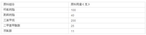 环氧聚砜胶是以环氧树脂和聚砜树脂为主要原料,配合以溶剂、固化剂等组成的,它主要用于粘接各种金属结构件、各种刃具及其它工具等。该胶粘剂的特点是具有高的粘接强度、综合性能好,但其耐水、耐湿热性能稍差。 配方