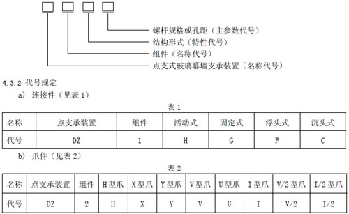 前 言 本标准第 5 章中5.2.1 5.2.2 5.2.3 为强制性条文其余为推荐性条文 组成装置的零部件 凡有同类坚固件国家标准者其性能要求和试验方法均予引用 本标准由建设部标准定额研究所提出 本标准由建设部建筑制品与构配件产品标准化技术委员会归口 本标准负责起草单位 珠海市晶艺玻璃工程有限公司深圳市三鑫特种玻璃股份有限公司 本标准主要起草人 罗忆韩平元冯恕林龙王德勤赵家滨徐宁李涛许文龙于泽正 本标准于 2001 年11 月21 日首次发布 1 范围 本标准规定了点支式玻璃幕墙金属支承装置的要求力学性能试验方法检验规则及标志包装 贮存和运输等 本标准适用于点支式玻璃幕墙装置的金属支承装置 2 引用标准 下列标准所包含的条文通过本标准中引和而构成为本标准的条文本标准出版时所示版本 均为有效所有标准都会被修订使用本标准的各方应控讨使用最新版本的可能性 GB 191 2000 包装储运图示方法 GB/T 228 1987 金属拉伸试验方法 GB/T 232 1999 金属弯曲试验方法 GB/T 699 1999 优质碳素结构钢技术条件 GB/T 700 1988 碳素结构钢 GB/T 1220 1992 不锈钢棒 GB/T 1591 1994 低合金高强度结构钢 GB/T 2100 1980 不锈钢耐酸钢铸件技术条件 GB/T 2828 1987 逐批检查计数抽样程序及抽样表适用连续批的检查 GB/T 2829 1987 周期检查计数抽样程序及抽样表适用生产过程稳定性的检查 GB/T 3098.1 2000 坚固件机械性能螺栓 螺钉和螺柱 GB/T 3098.2 2000 坚固件机械性能螺母 GB/T 3098.6 2000 坚固件机械性能不锈钢螺栓 螺钉螺柱和螺母 GB/T 6414 1999 铸件尺寸公差 GB/T 8923 1988 涂装前钢材表面锈蚀等级和除锈等级 JB/T 7528 1994 铸件质量评定方法 3 定义 本标准采用下列定义 3.1 点支式玻璃幕墙 the point suspended glass curtain wall 玻璃面板通过点支承装置与其支承结构组成的幕墙 3.2 支承装置 support device 玻璃面板与支承结构之间的连接装置由连接件和爪件组成 3.3 连接件 connecting part 连接玻璃面板与爪件的组件 3.4 爪件 spider linking part 安装在结构支承座和连接件之间的组件 4 分类 4.1 连接件[附录A 提示的附录表A1] a) 连接件按构造可分为活动式和固定式 b) 连接件按外形可分为浮头式和沉头式 4.2 爪件[附录A 提示的附录表A2] a) 爪件按固定点数和外形可分为 单点爪V/2 型和I/2 型 二点爪U 型V 型和I 型 三点爪Y 型 四点爪X 型和H 型 多点爪 b) 爪件按常用孔距可分为204mm 224mm 250mm 4.3 标记 4.3.1 型号规则 连接件和爪件的型号由名称代号点支式玻璃幕墙支承装置组件特性代号结构形式和主参数代号螺杆规格或孔距等组成。