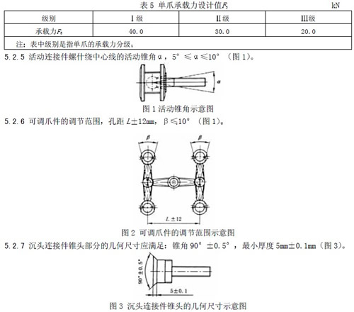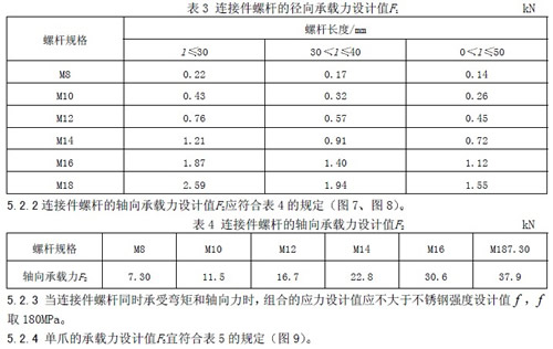 5 要求 5.1 材料 5.1.1 爪件可采用碳素钢不锈钢和铝合金等材料其性能必须符合相应的国家标准 5.1.2 连接件中球铰螺杆必须采用1Cr18Ni9Ti 0Cr18N9 或性能更优的不锈钢材料其他零件采的材料就符合表6 的要求 5.1.3 与玻璃面板接触的垫圈和垫片应采用如尼龙或纯铝等材料 5.2 支承装置的性能 5.2.1 连接件螺杆的径向承载力设计值F1应符合表3 的规定(图6)。