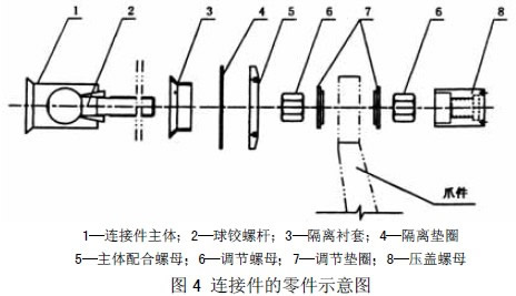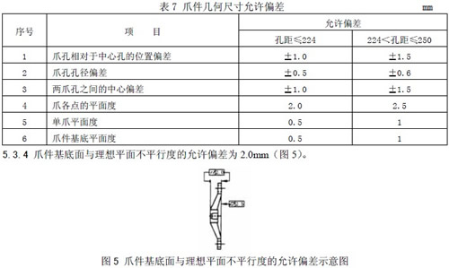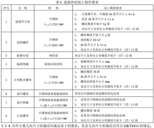 5.2.8 连接件与爪件装配调整量,在三维方向各±6mm 5.3 加工要求 5.3.1 加工表面粗糙度应不低于Ra3.2 m 5.3.2 紧固件的机械性能应符合GB/T3098.1 GB/T3098.2 和GB/T3098.6 的要求 5.3.3 连接件中各零件图4 的加工制作宜满足表6 的要求。